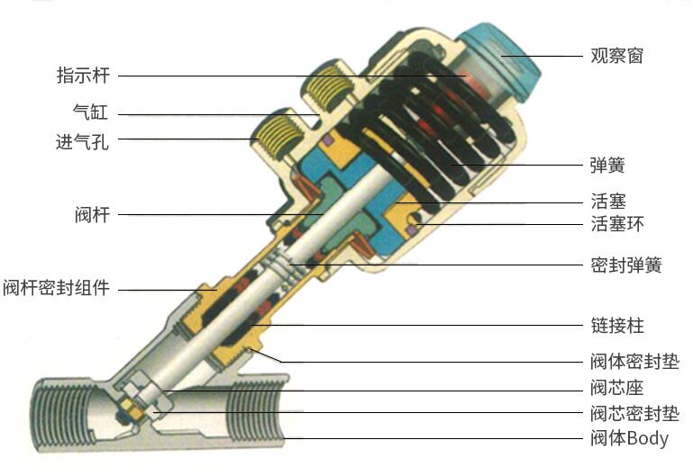 8、短命命导杆:气动角座阀阀杆契形特氟隆密封,防止赃物导入。自润滑,免维护。阀杆经特别处理以确保最佳固定,并能自动校正位置。